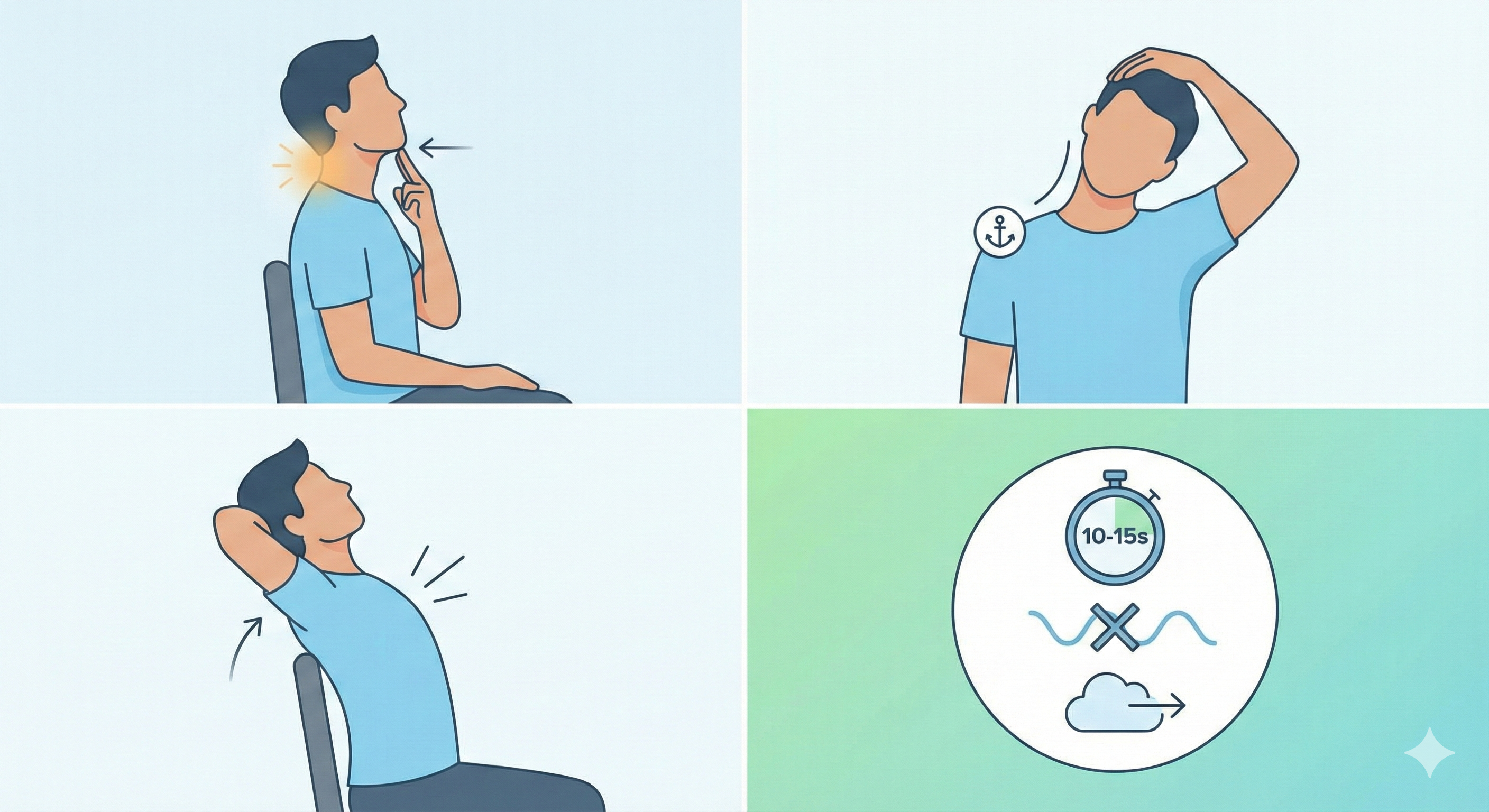 - 턱 당기기(Chin Tuck): 가슴을 펴고 시선은 정면을 향한 상태에서 손가락으로 턱을 뒤로 지긋이 밀어줍니다. 뒷목 근육이 길게 늘어나는 느낌을 받는 것이 핵심입니다.