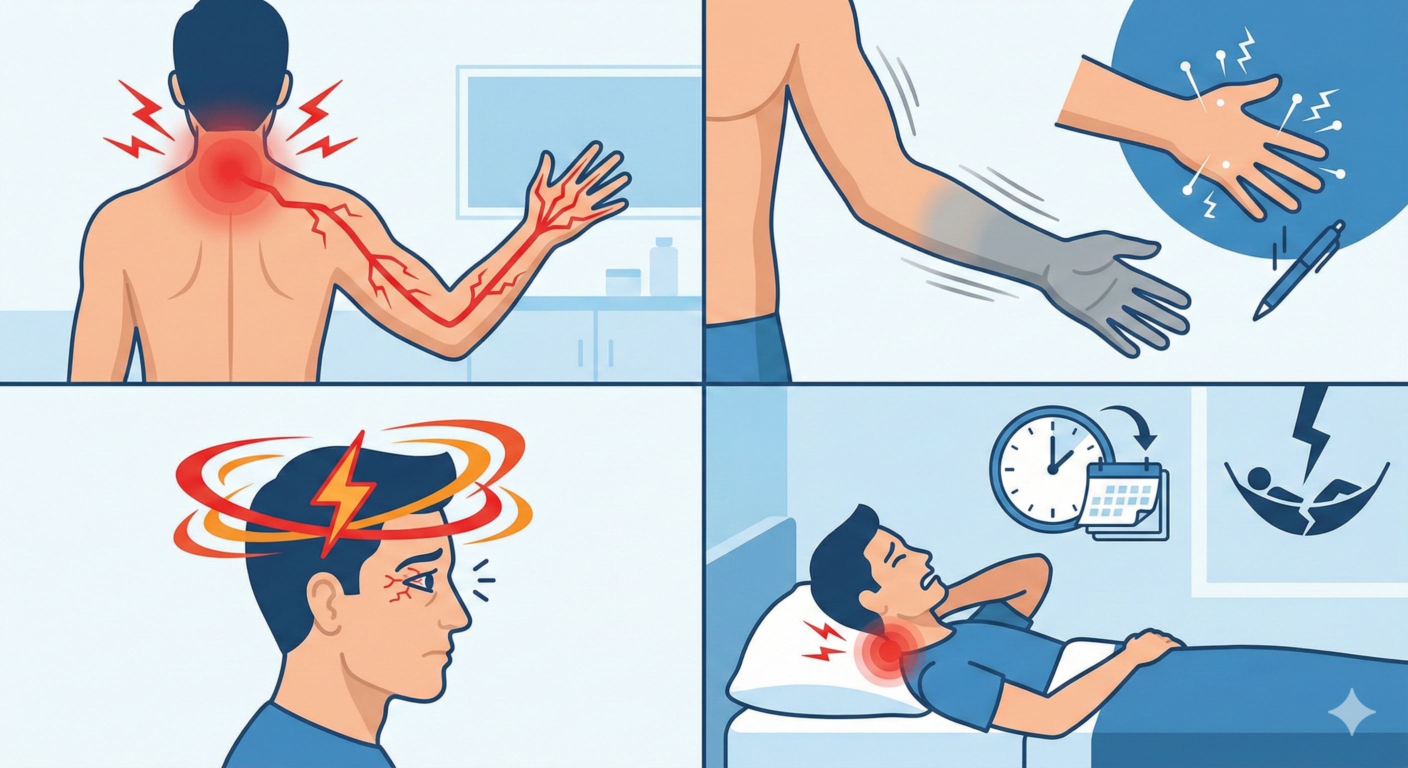 - 방사통: 통증이 목에만 머물지 않고 어깨, 팔, 손끝으로 뻗어 나가는 경우.
