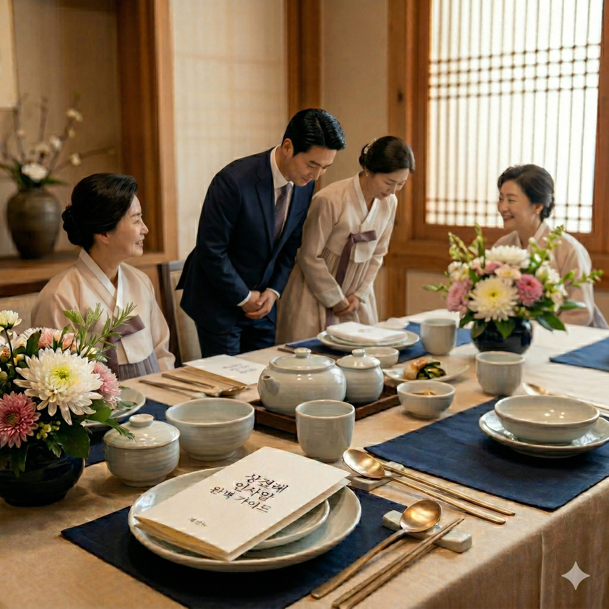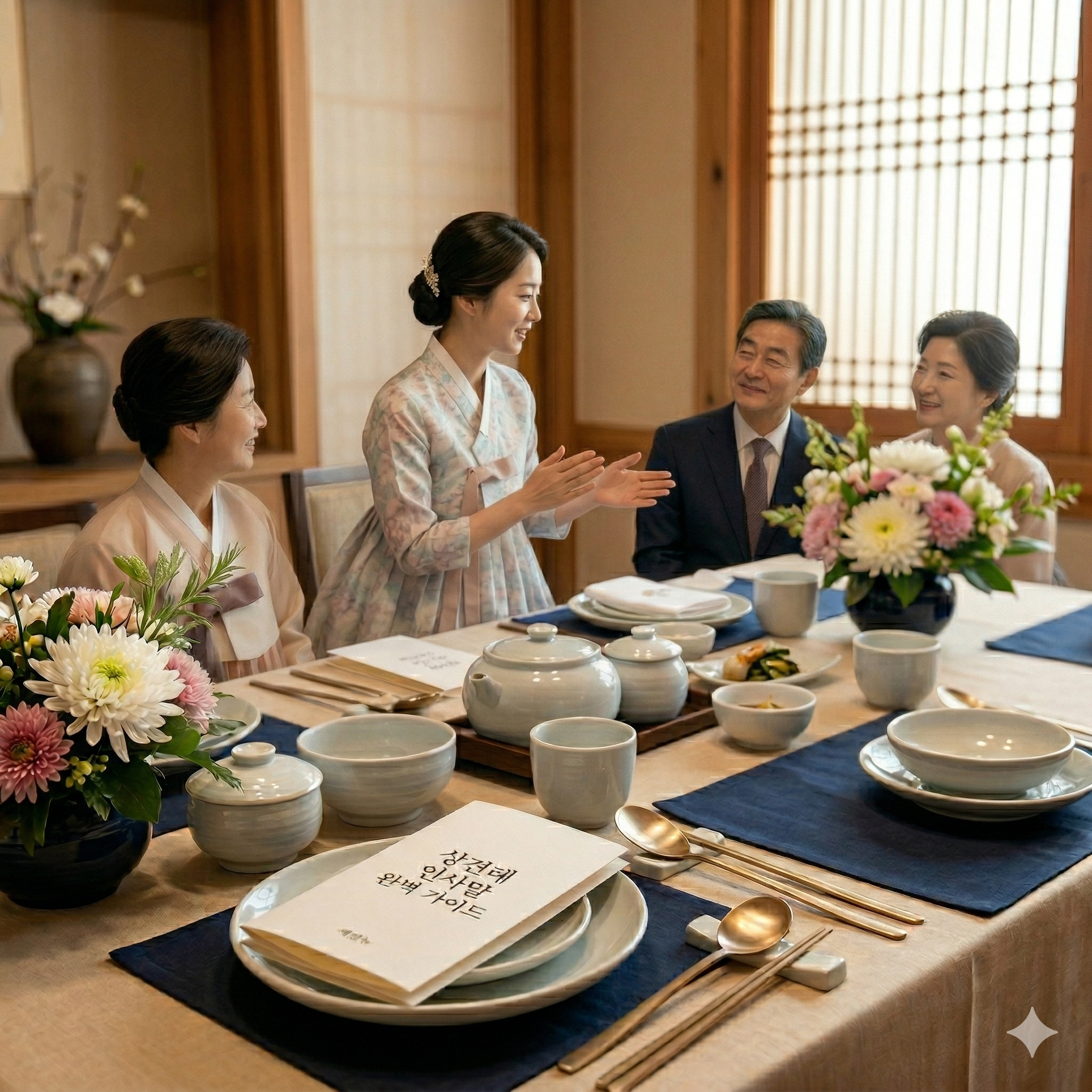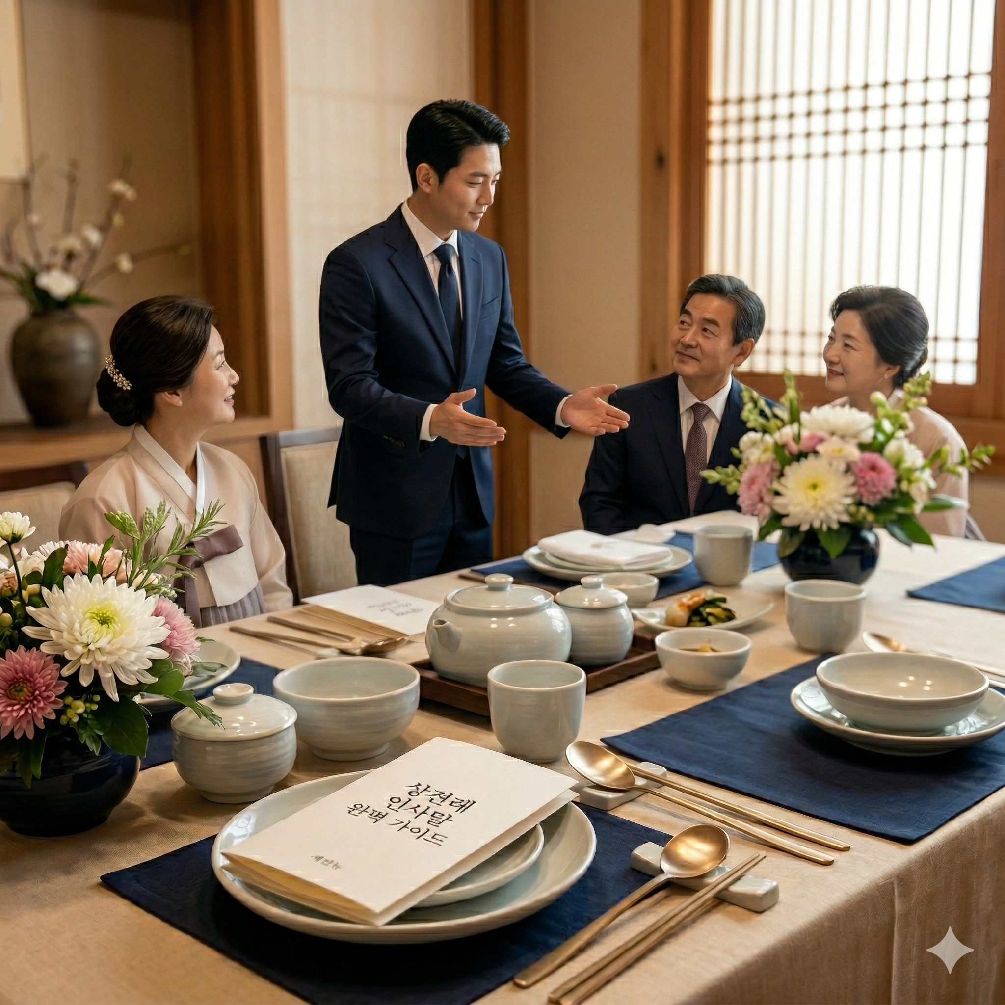 보통은 신랑 측이 먼저 도착해 기다리는 것이 예의이며, 신부 측이 도착하면 모두 일어나 정중히 목례를 나눕니다.