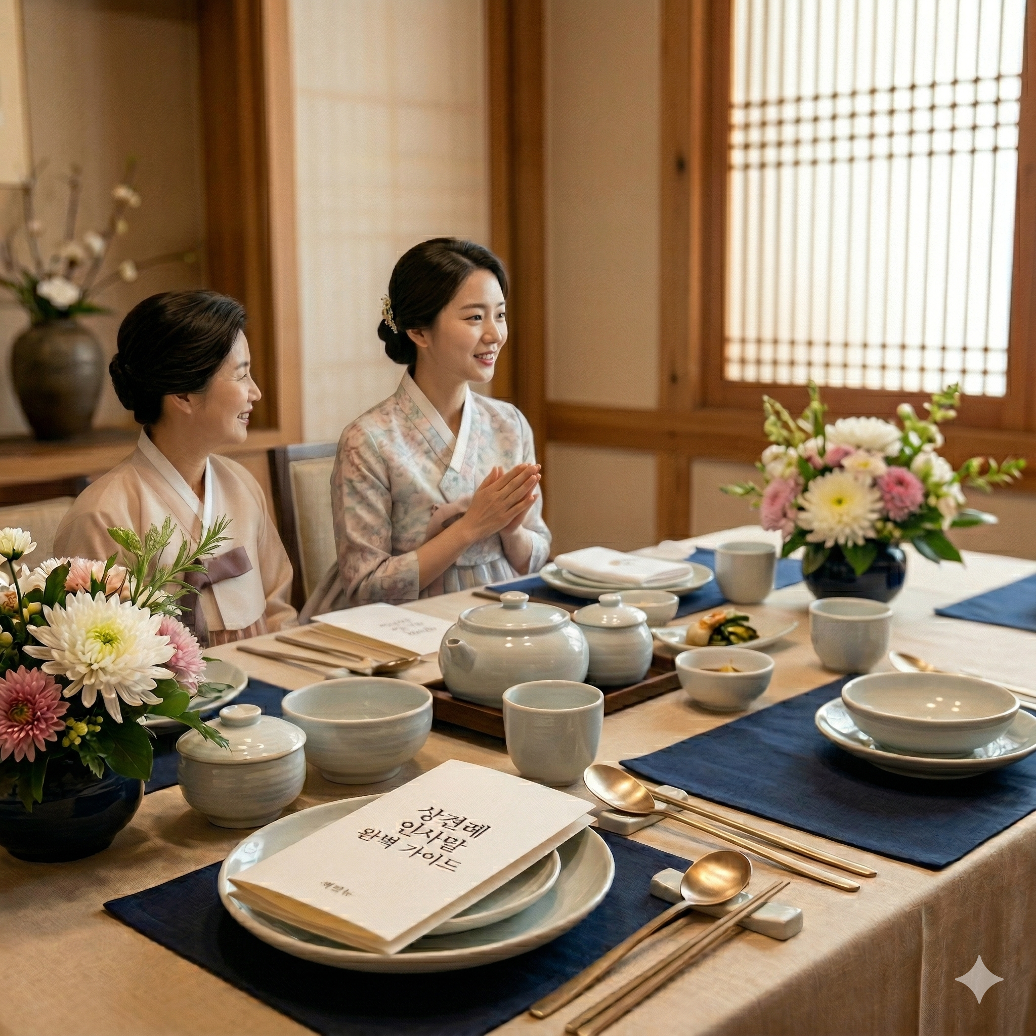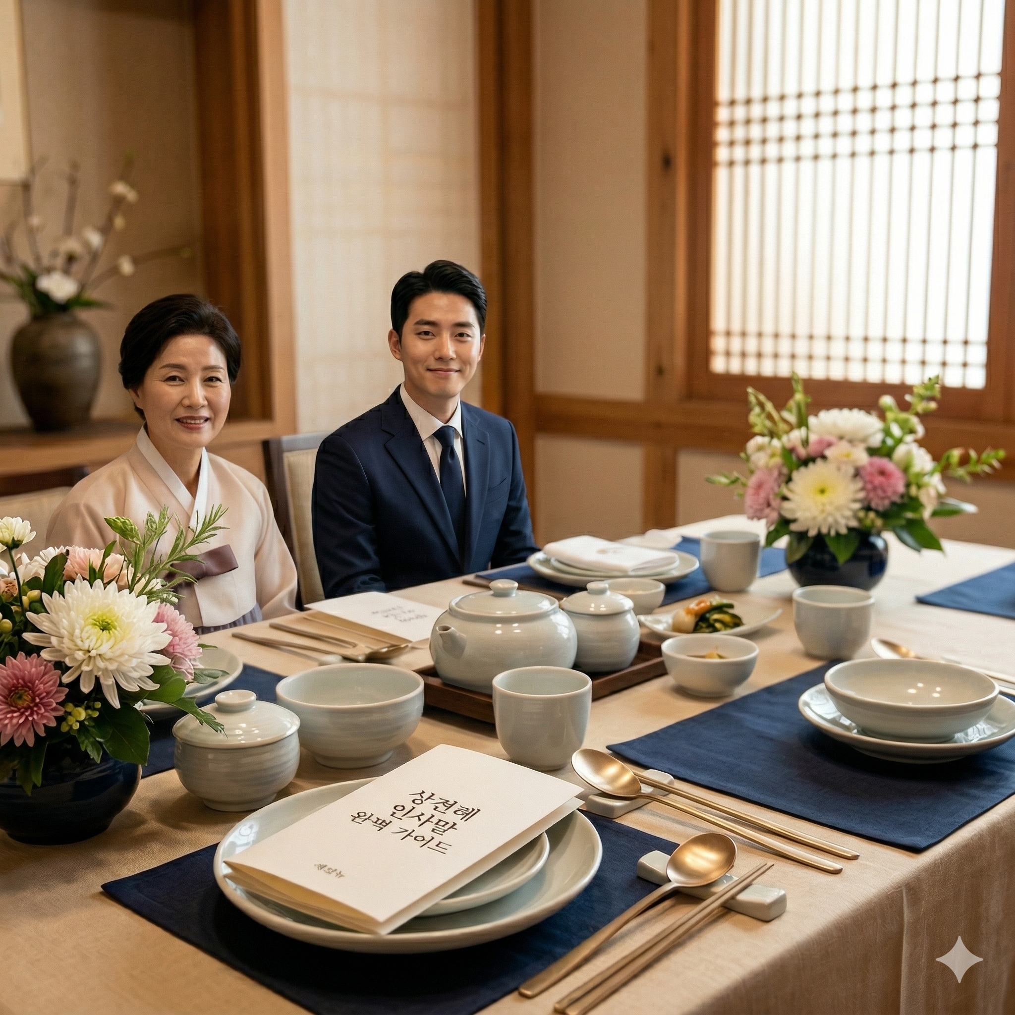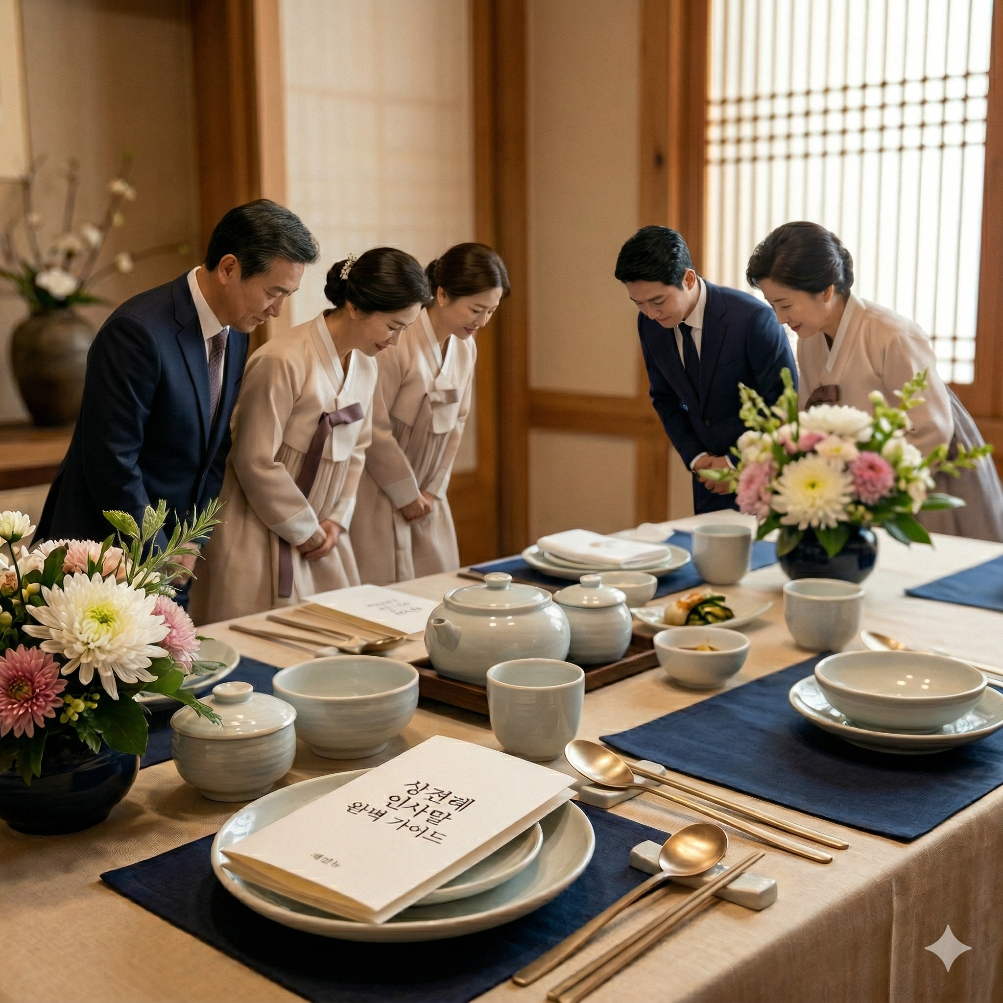 보통은 신랑 측이 먼저 도착해 기다리는 것이 예의이며, 신부 측이 도착하면 모두 일어나 정중히 목례를 나눕니다.